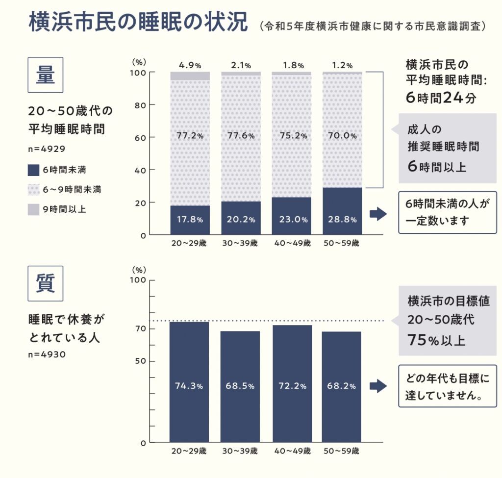 下記の図は横浜市健康福祉局が発表している横浜市の睡眠の時間と質に関する調査のグラフ(令和5年度)となります。
