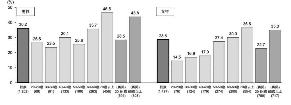 全体の平均では男性が36.2%、女性が28.6%となっています。更に20〜64歳に限ると女性は22.7%しか運動習慣がないということがわかります。
